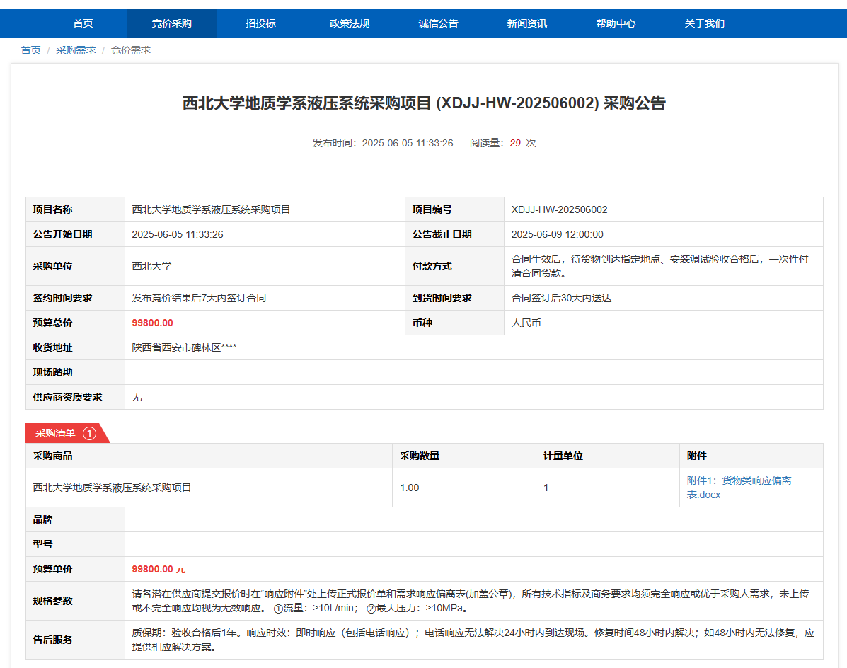 九游会在线登录官网地质学系液压系统采购项目(XDJJ-HW-202506002)竞价采购公告 作者: 编辑: 时间:2025-06-05 原公告链接:https://www.ejingcai.com.cn/site/bidding/detail/18680