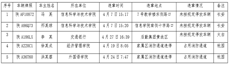 2023年4月份校园交通违章曝光 作者: 编辑: 时间:2023-05-10 为加强校内道路交通管理,规范校内交通秩序,根据《九游会在线登录官网校园道路交通管理办法》的通知要求,现将2023年4月校园交通违章车辆曝光如下。 希望广大师生员工遵守校园道路交通管理办法,维护校园交通安全,共同营造良好的校园交通秩序。 九游会在线登录官网道路交通安全委员会 2023年5月10日