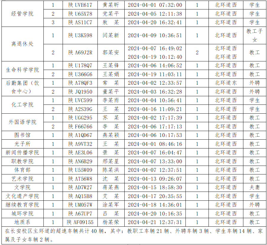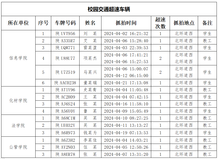 为加强校内道路交通安全管理,规范校内交通秩序,根据《九游会在线登录官网校园道路交通管理办法》有关要求,现将2024年4月校园交通违章车辆予以曝光,4月份教工超速车辆占52%、学生超速车辆占35%、外聘职工及教工家属车辆占12%,请所在单位加强对本单位违章师生员工的教育和管理,对于校内曝光超速的学生车辆将取消下一年度的通行证办理资格。