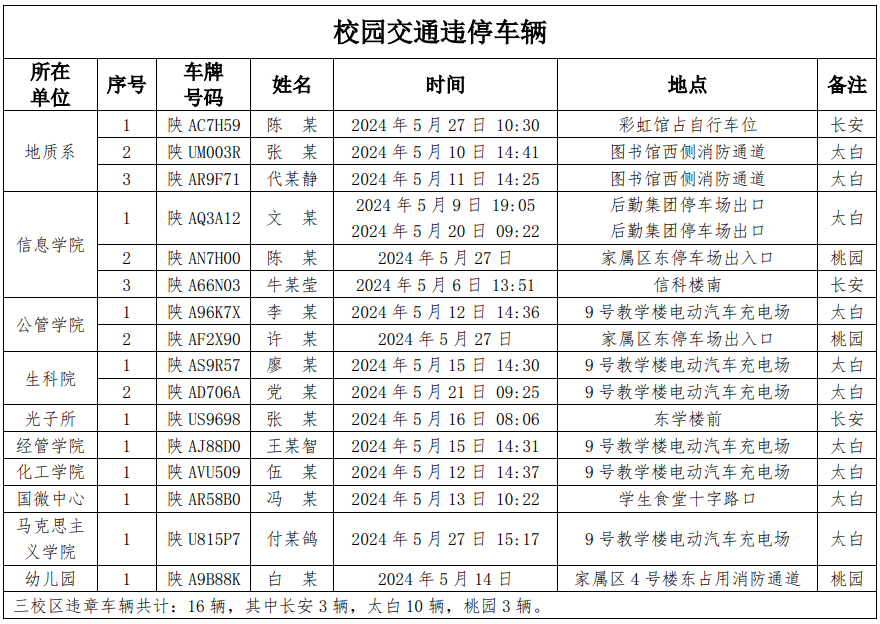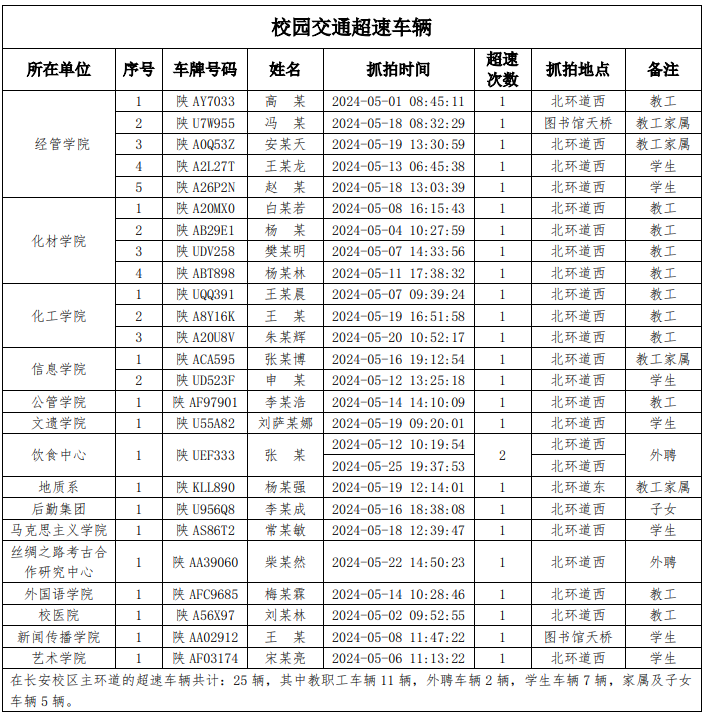 为加强校内道路交通安全管理,规范校内交通秩序,根据《九游会在线登录官网校园道路交通管理办法》有关要求,现将2024年5月校园交通违章车辆予以曝光,所在单位负责对本单位违章师生员工进行交通安全教育和日常管理,对于校内曝光超速的学生车辆将取消下一年度的通行证办理资格。