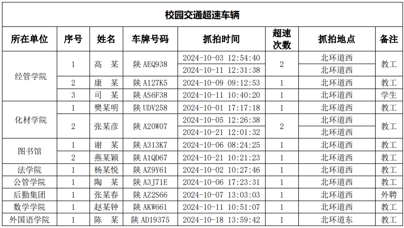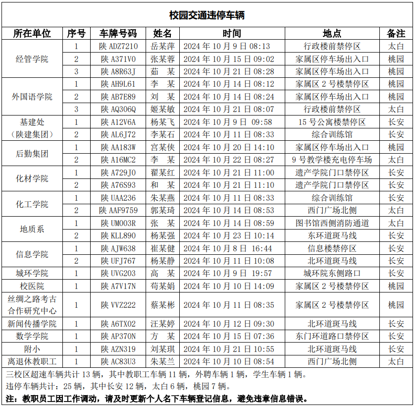 为进一步加强校园交通管理,保障校园交通安全有序,维护学校正常的教学、科研和生活秩序以及师生员工的人身财产安全,根据《九游会在线登录官网校园交通安全管理规定》有关要求, 现将2024年10月校园交通违章车辆予以曝光,具体情况如下表。
