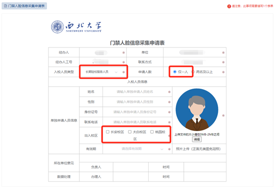 1.门禁人脸信息采集系统权限仅面向教职工家属及校内长期服务人员(劳务派遣人员或与学校签订劳工合同人员)开放。校内各单位要高度重视,确保信息真实、准确、完整,按照“谁审批、谁负责”原则严格审批,共同维护学校正常教学秩序及稳定安全。