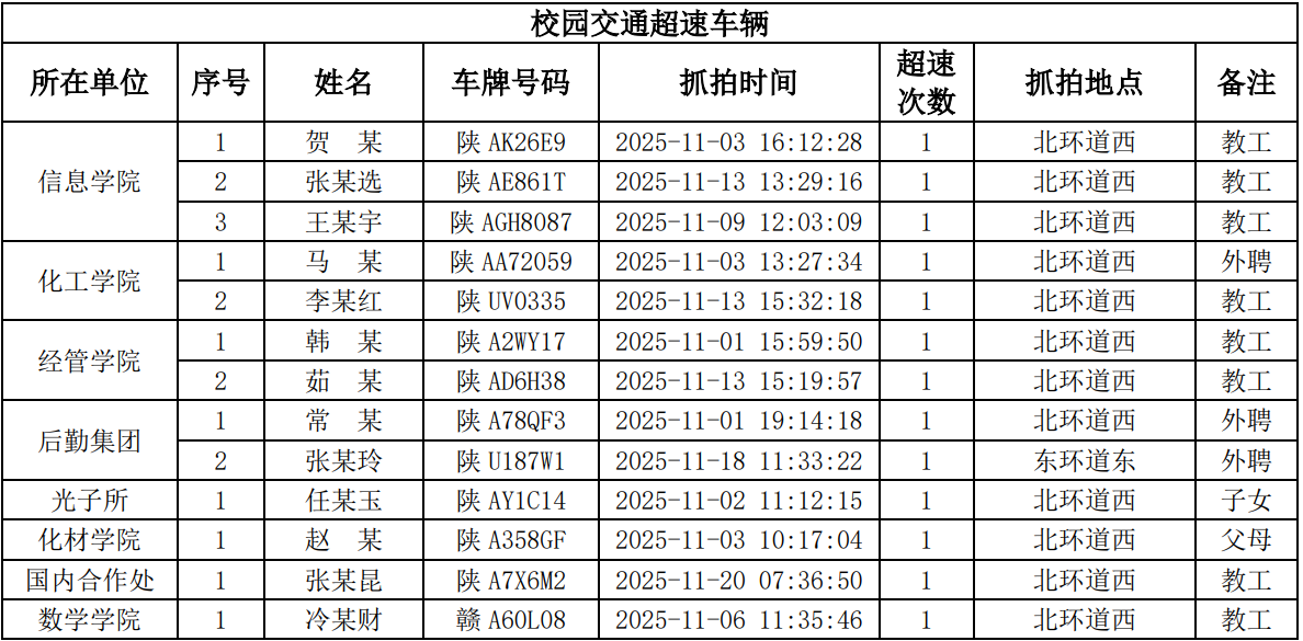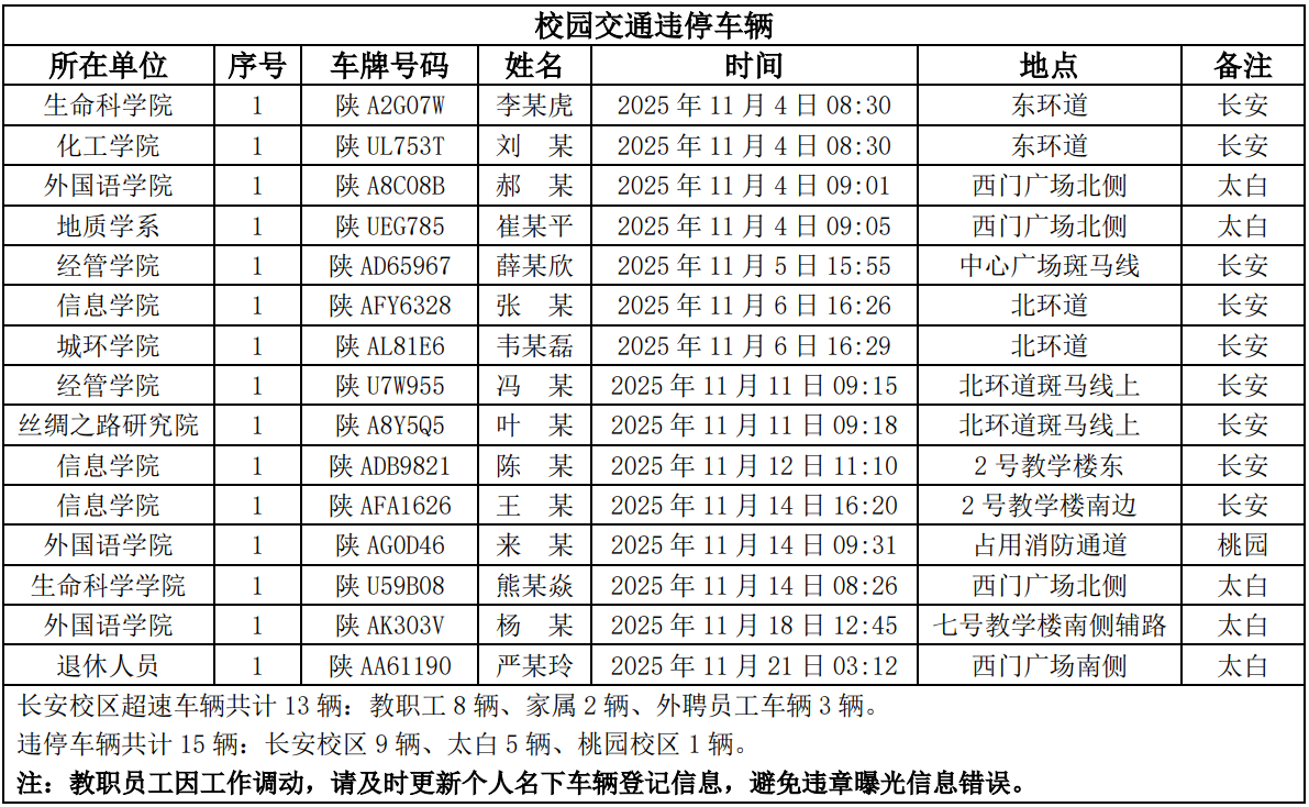为进一步加强校园交通管理,保障校园交通安全有序,维护学校正常的教学、科研和生活秩序,切实保护师生员工的人身财产安全,根据《九游会在线登录官网校园交通安全管理规定》的相关要求,现将2025年11月校园交通违章车辆予以曝光,具体要求与违章信息如下: