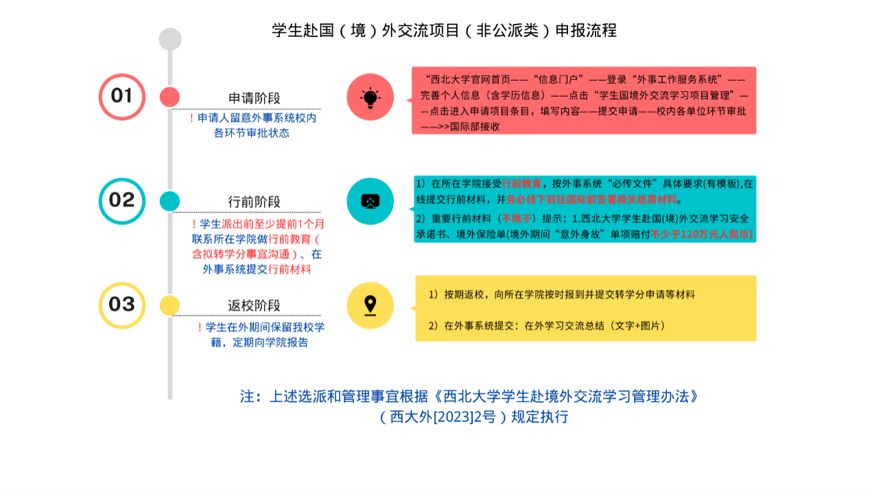3. 申请学生在确定录取后,应及时履行出国(境)前相关行前手续。请务必了解有关本项目学生的申请、行前、返校阶段情况说明,请见附件2 申报流程说明或下图。