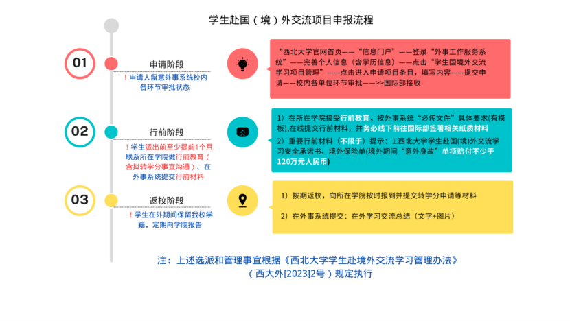 3.申请学生在确定录取后,应及时履行出国(境)前相关行前手续。请务必了解有关本项目学生的申请、行前、返校阶段情况说明,请见下图。