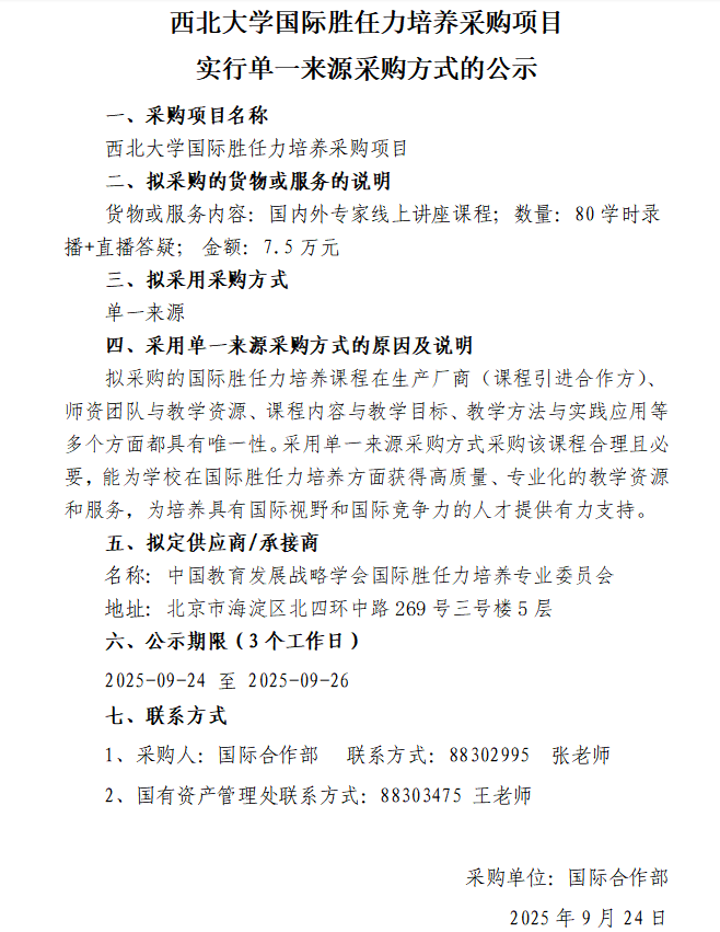 九游会在线登录官网国际胜任力培养采购项目实行单一来源采购方式的公示