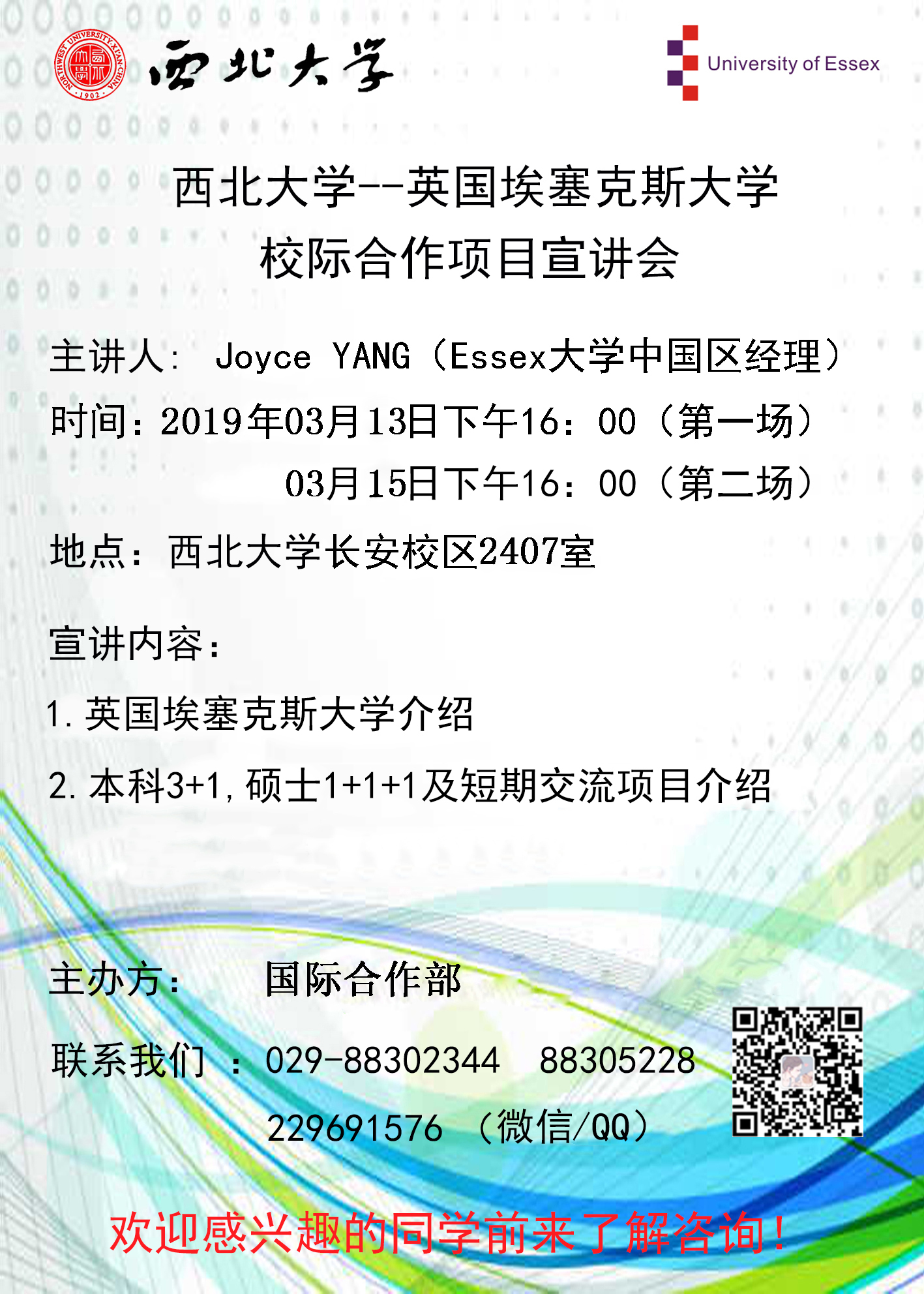 项目宣讲会将于2019年3月13日、15日下午16:00在长安校区2407教室举行,英国埃塞克斯大学中国区负责人Joyce将为同学们详细介绍项目信息及报名要求,欢迎感兴趣的同学前来参加。