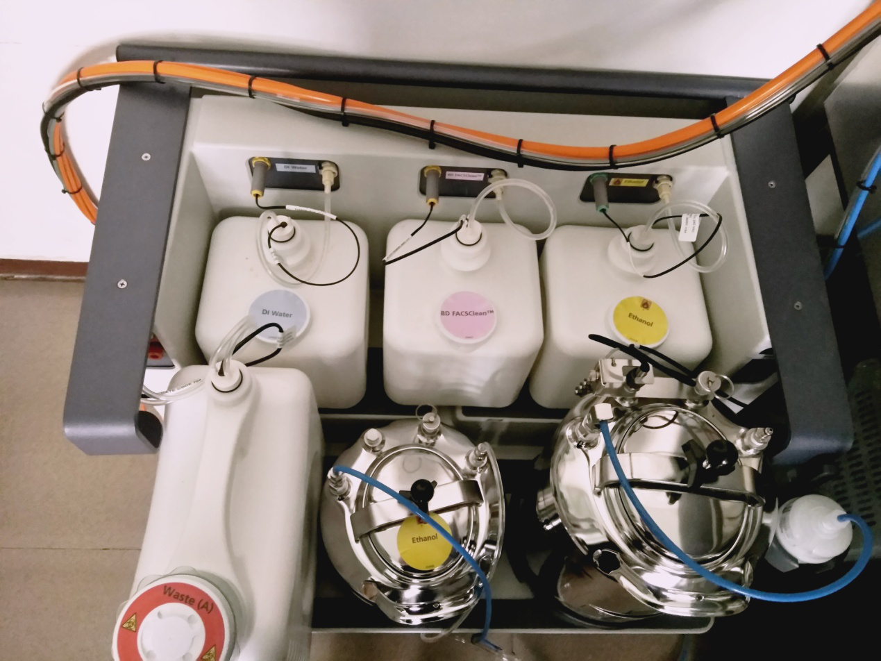 独立的液流车用于向流式细胞仪提供鞘液、清洗液,并收集废液。液流车自行提供空气压力和真空状态,适合各种细胞的分选应用。