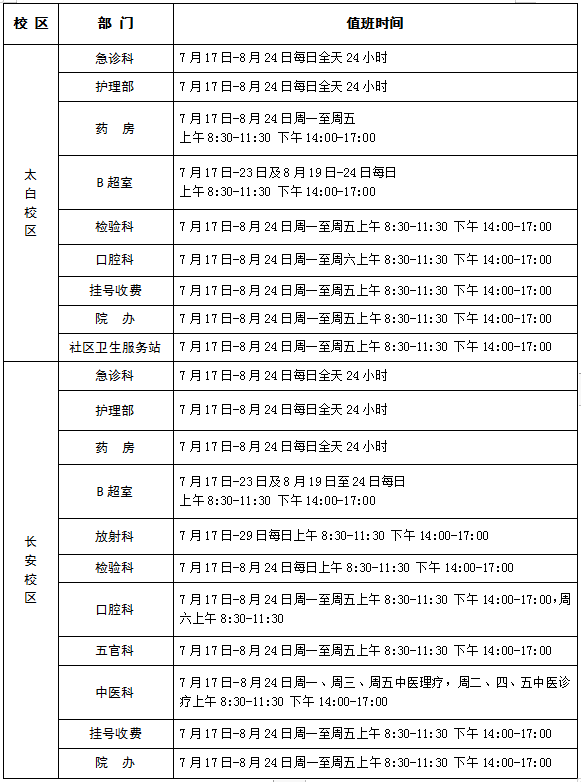 2023年校医院暑假期间医疗工作安排 作者: 编辑: 时间:2023-07-17 全体师生员工及社区居民: 根据学校《关于2023年暑假安排的通知》,为持续做好校内医疗保障,结合医院实际情况,现将暑假期间(7月17日至8月24日)校医院医疗工作安排通知如下: 一、医院值班安排 二、医院值班电话 太白校区: 029-88303120(急诊科) 029-88302922(办公室) 长安校区: 029-88309120(急诊科) 029-88308200(办公室) 九游会在线登录官网医院 2023年7月17日