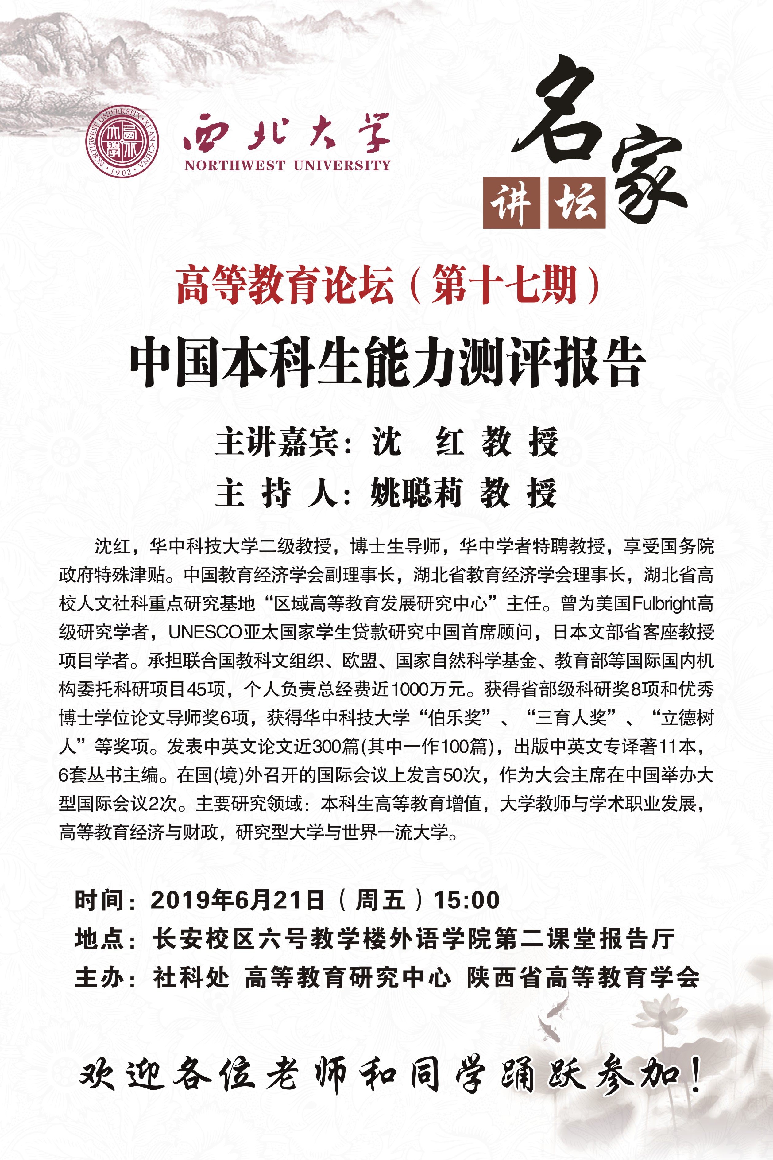 关于举办"名家讲坛"暨"高等教育论坛"(第十七期)的通知 作者: 编辑: 时间:2019-06-19 10:43 校内各有关单位:九游会在线登录官网名家讲坛暨高等教育论坛(第十七期)即将举行,现将具体情况通知如下:讲座题目:中国本科生能力测评报告主讲嘉宾:沈 红 教授讲座时间:6月21日(周五)15:00讲座地点:长安校区六号教学楼外语学院第二课堂报告厅主办单位:社科处、高等教育研究中心、陕西省高等教育学会欢迎各位老师和同学踊跃参加!