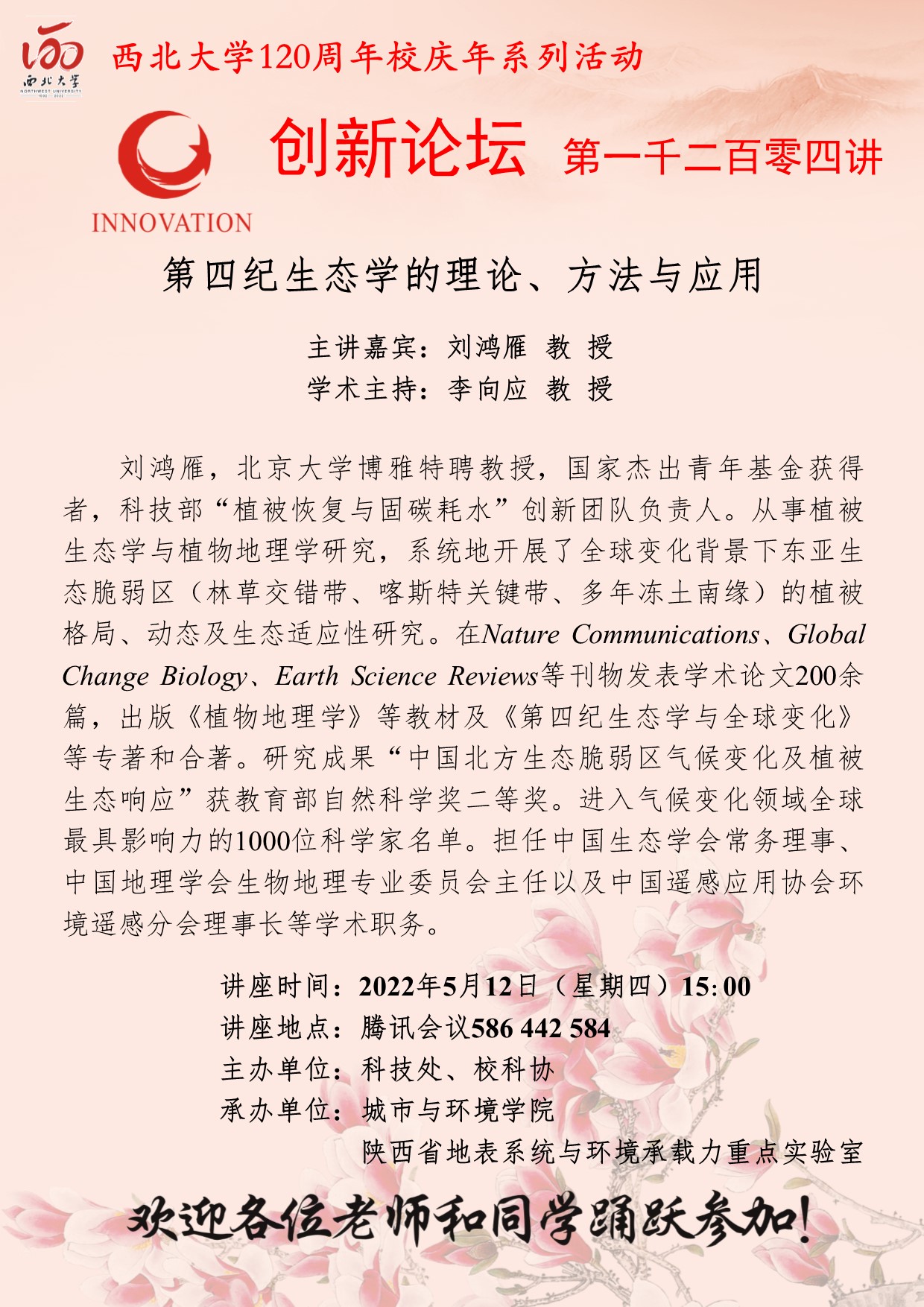 九游会在线登录官网创新论坛第一千二百零四讲暨120周年校庆年系列活动:第四纪生态学的理论、方法与应用