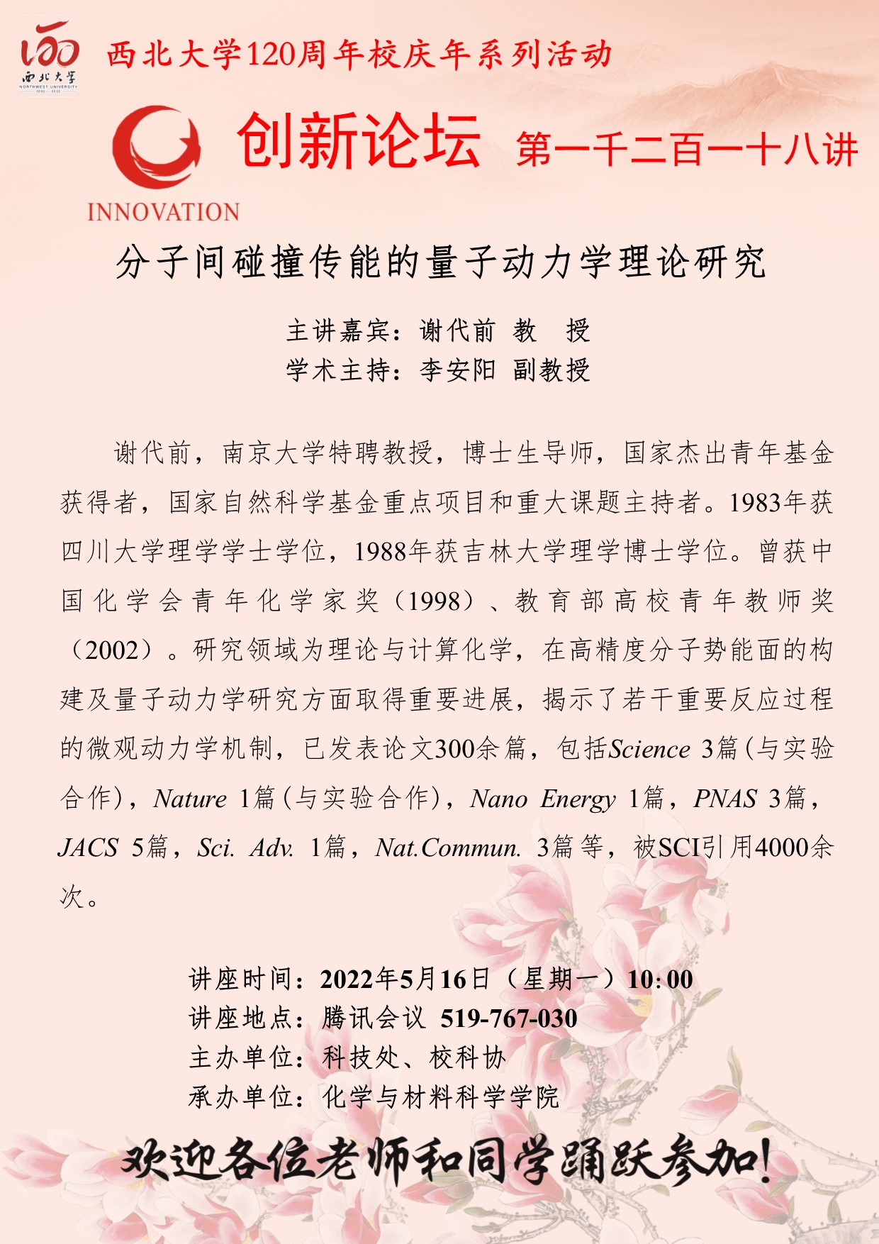 九游会在线登录官网创新论坛第一千二百一十八讲暨120周年校庆年系列活动:分子间碰撞传能的量子动力学理论研究