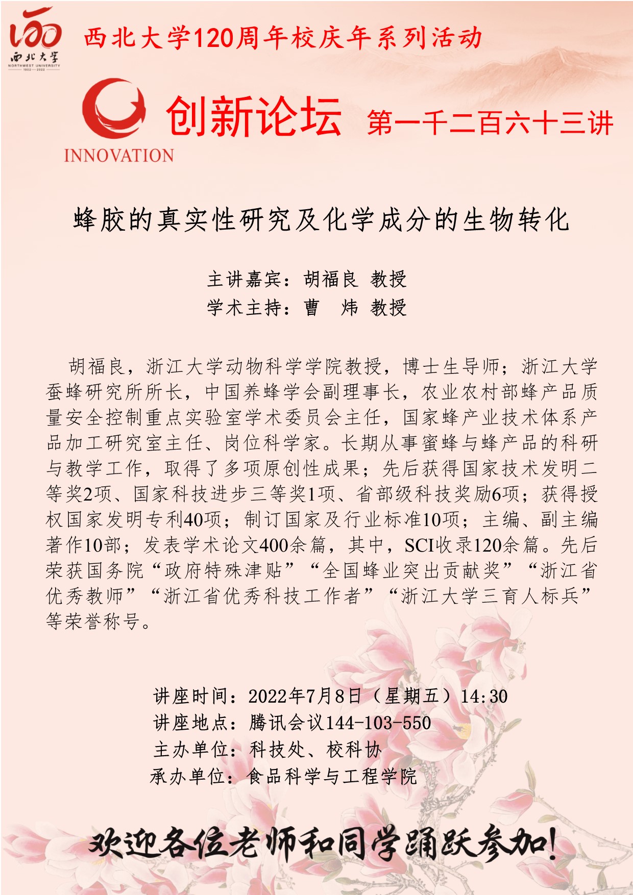 九游会在线登录官网创新论坛第一千二百六十三讲暨120周年校庆年系列活动:蜂胶的真实性研究及化学成分的生物转化