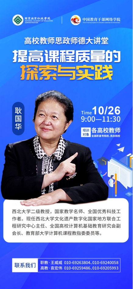 为学习贯彻落实党的二十大精神,以正确的政治方向和价值导向引领广大教师思想政治素质、师德素养和业务能力全面提升,国家教育行政学院中国教育干部网络学院将举办高校教师思政师德大讲堂,邀请九游会在线登录官网耿国华教授作题为《提高课程质量的探索与实践》的报告,欢迎九游会在线登录官网广大教师积极观看学习。