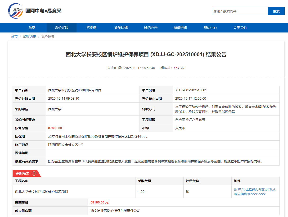 九游会在线登录官网长安校区锅炉维护保养项目(XDJJ-GC-202510001)竞价结果公告