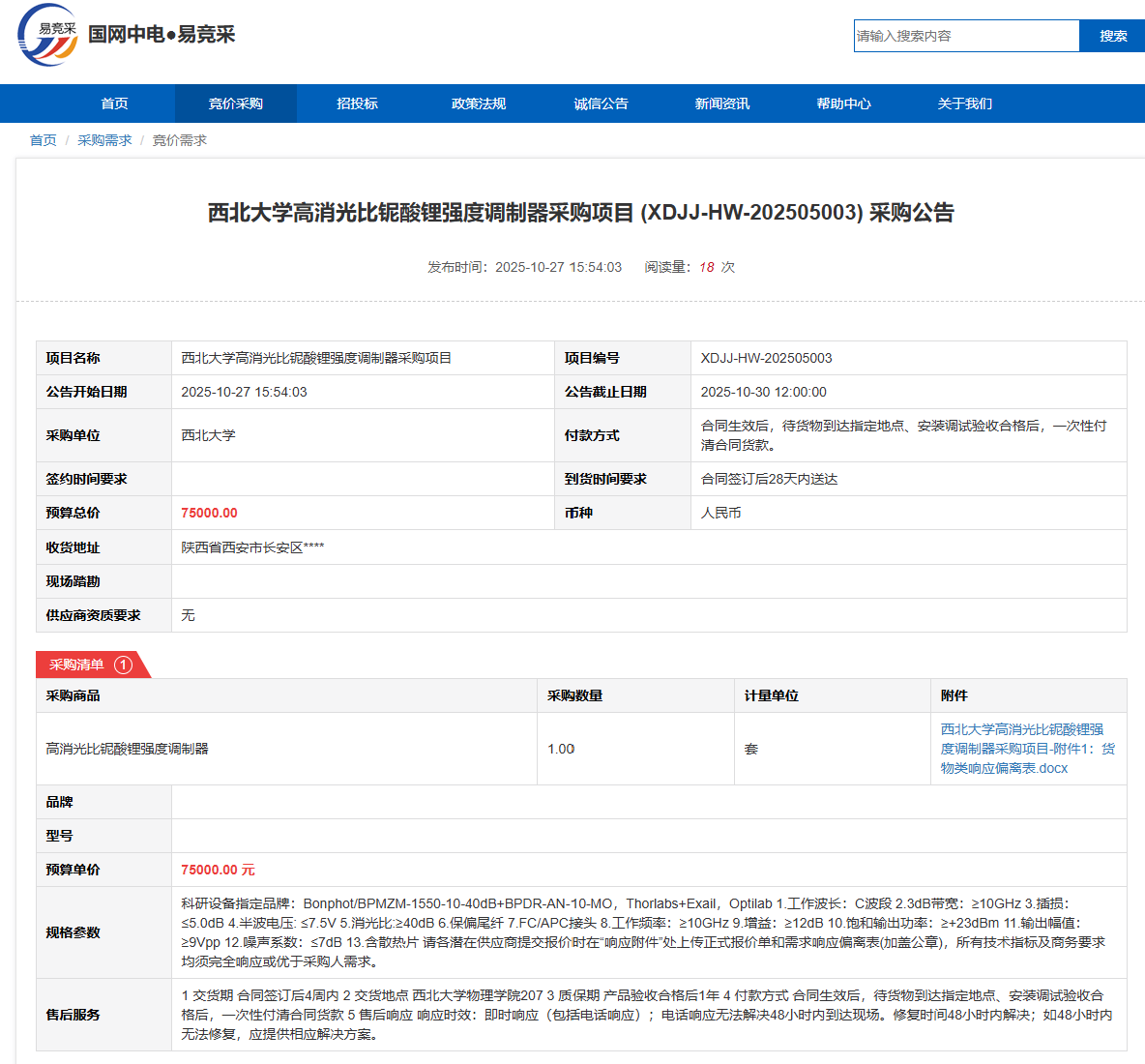 九游会在线登录官网高消光比铌酸锂强度调制器采购项目(XDJJ-HW-202505003)竞价采购公告