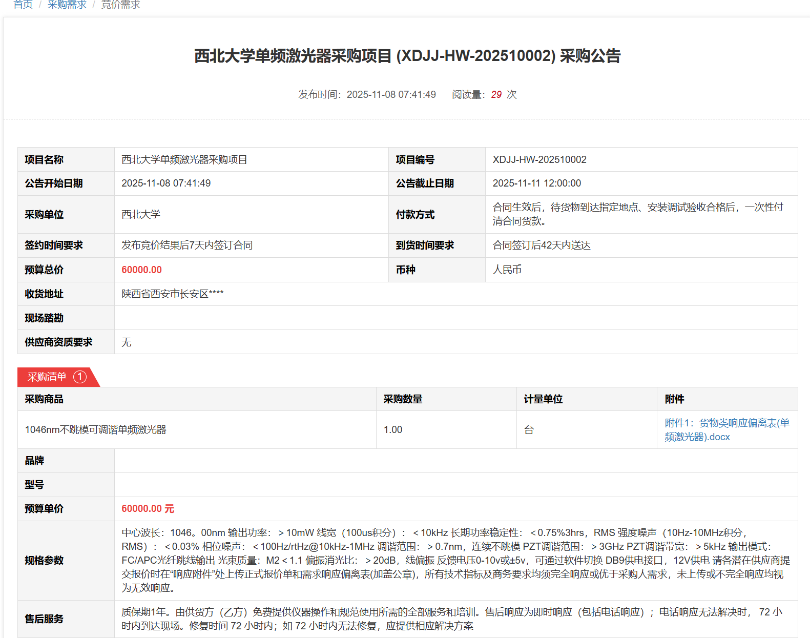 九游会在线登录官网单频激光器采购项目(XDJJ-HW-202510002)竞价采购公告