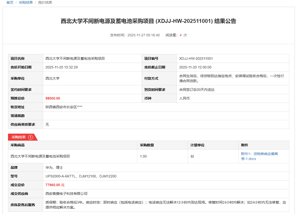 九游会在线登录官网不间断电源及蓄电池采购项目(XDJJ-HW-202511001)竞价结果公告