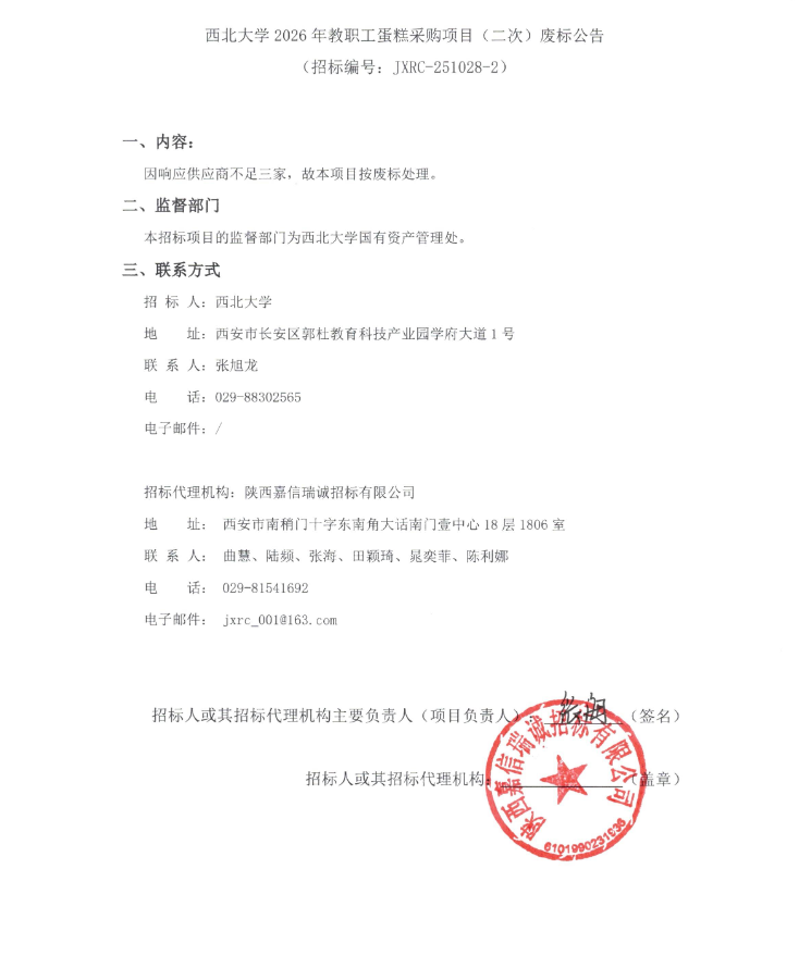 九游会在线登录官网2026年教职工蛋糕采购项目(二次)废标公告