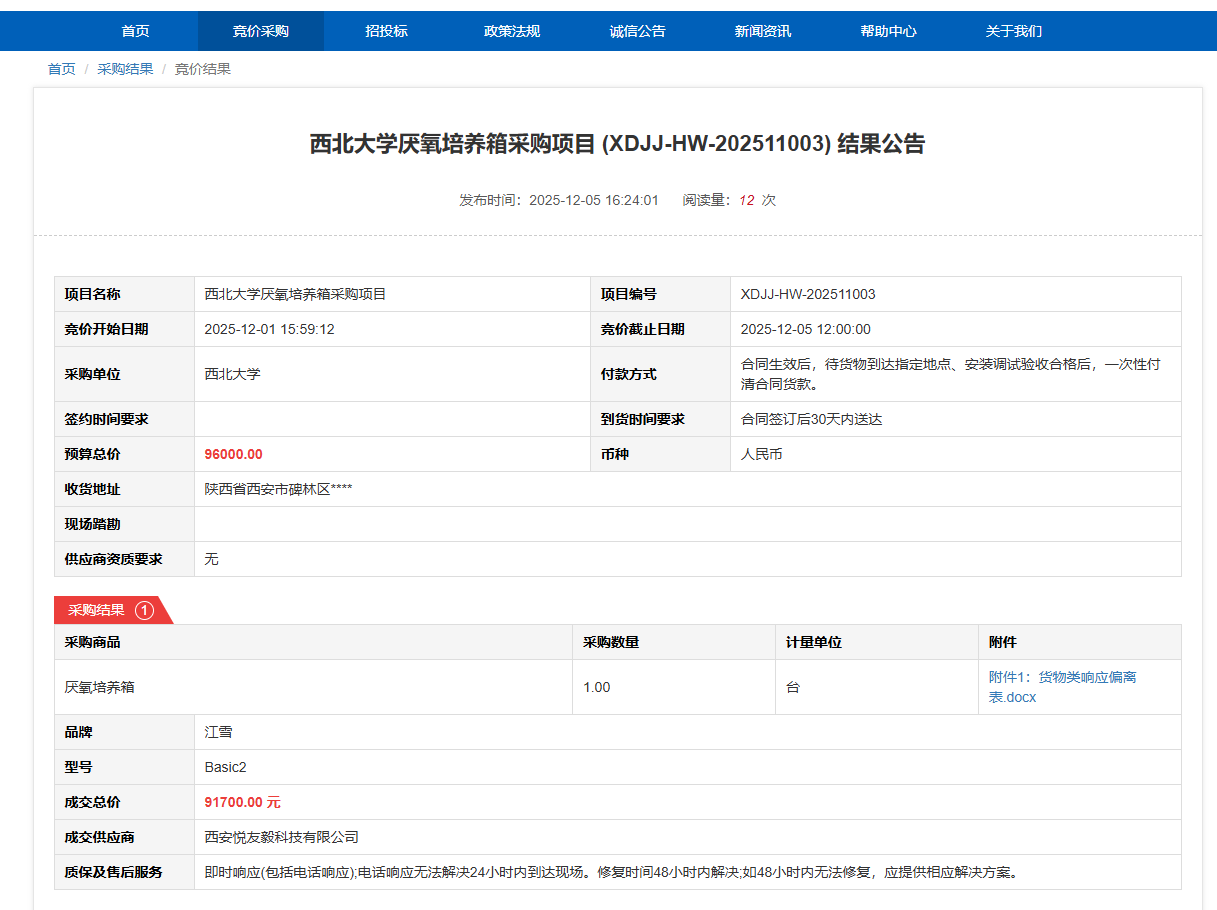 九游会在线登录官网厌氧培养箱采购项目(XDJJ-HW-202511003)竞价结果公告